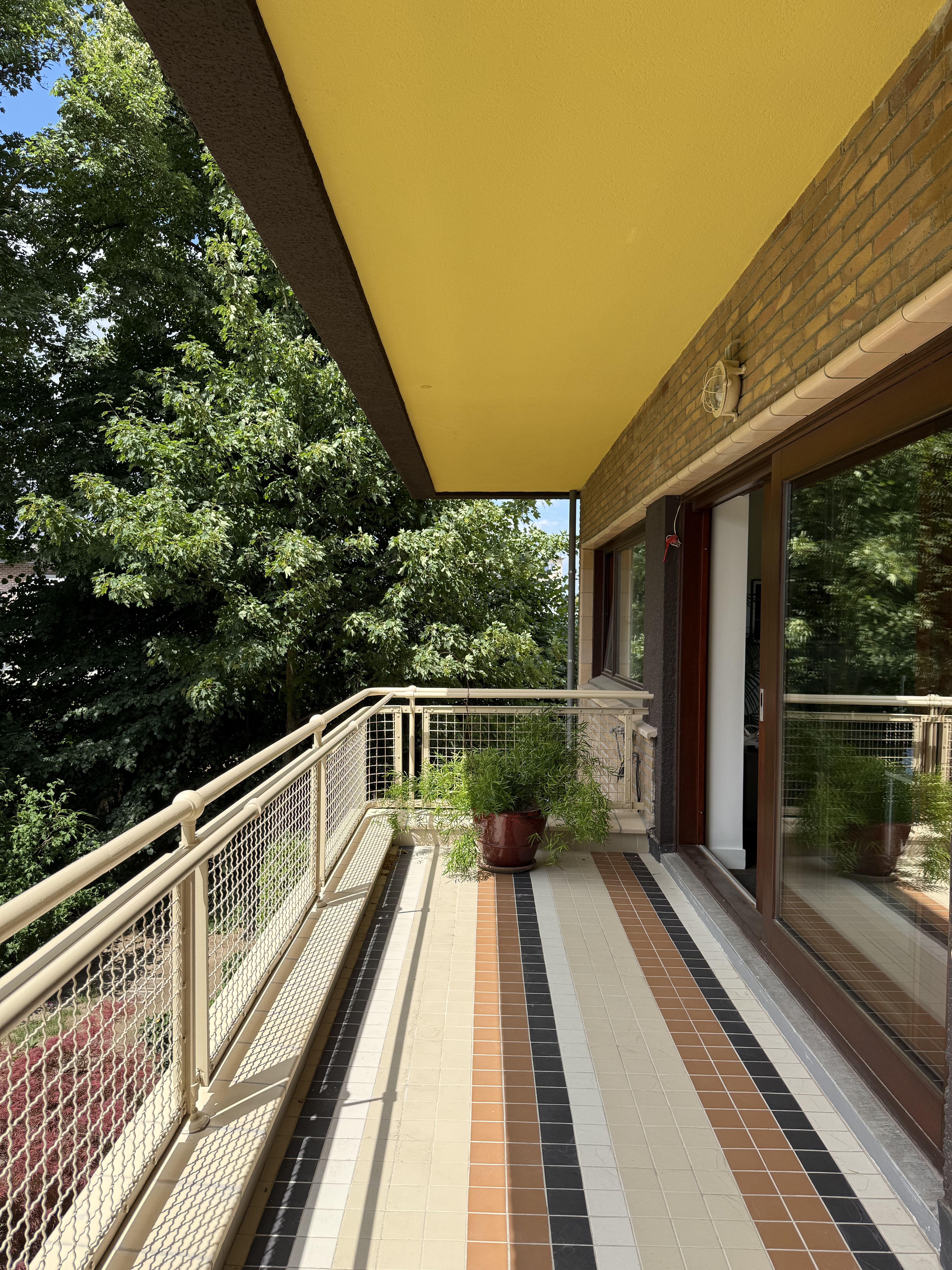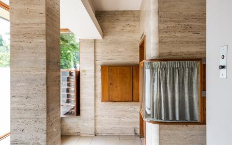 Tot slot werd het oorspronkelijke buitenschrijnwerk van de gemeenschappelijke traphallen in moulmein teak gerestaureerd. Ondanks het duurzame karakter van de houtsoort waren de beschermlagen verschraald, met lokale verwering en lichte vervormingen tot gevolg. De restauratie vertrok vanuit maximaal behoud: plaatselijke houtinlagingen in dezelfde houtsoort, herstel van profileringen en vervanging enkel waar technisch noodzakelijk. De uitbuikende dubbelhoge raampartijen werden herpositioneerd, het schrijnwerk kreeg een aangepaste beschermende afwerking en het historisch beslag werd gereinigd en hersteld.